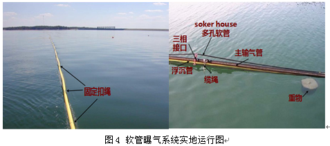 实地组装并运行该水质改善系统期间发现该系统的曝气系统、升降系统、控制系统能够可靠运行。气泡羽流能够均匀产生,在水面上可以见到气泡从水中溢出,水体溶解氧含量迅速增加。